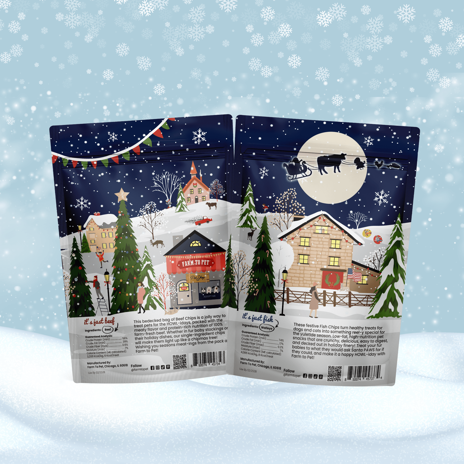It's always rewarding to give fur babies their favorite treats, and even more so at Chipmas! Farm to Pet Holiday Chips are the healthy way to include pets in holiday festivities, featuring our single-ingredient dog treats wrapped in fun packaging that's paw-fect for the season. Choose a 4-ounce bag of hearty iron-rich Beef Chips, omega-rich walleye Fish Chips, or one of each to make it a paw-liday surf and turf! In any flavor, these holiday dog treats make perfect gifts for dogs - and cats! - and the humans who love them.