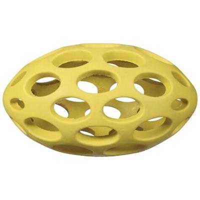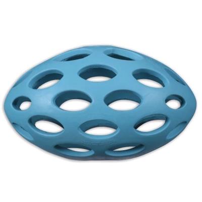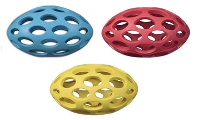 JW® Hol-ee® Football is a fun, versatile dog toy with the durability you've been searching for. Rubber gives it strength, bounce, and a soft texture while the unique open design allows you to stash some treats inside for hours of entertainment for your dog. This is a non toxic, durable, rubber, super-stretchy multi-purpose dog toy. It's a fantastic treat ball, wonderful training aid, great for fetch, toss and tug, chewing and teething. Ships in assorted colors.